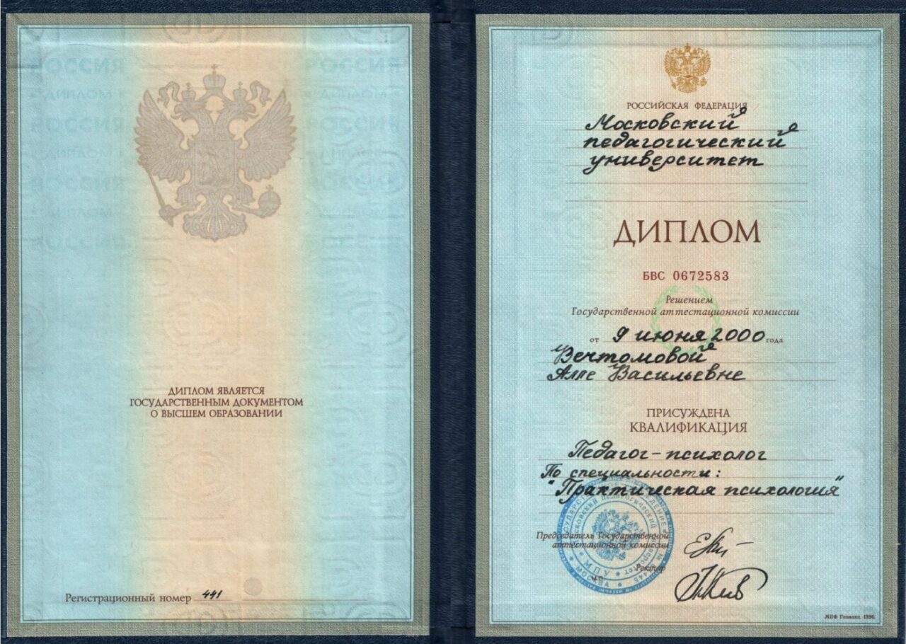 Специальность — практическая психология. Квалификация — педагог-психолог (2000 г.)